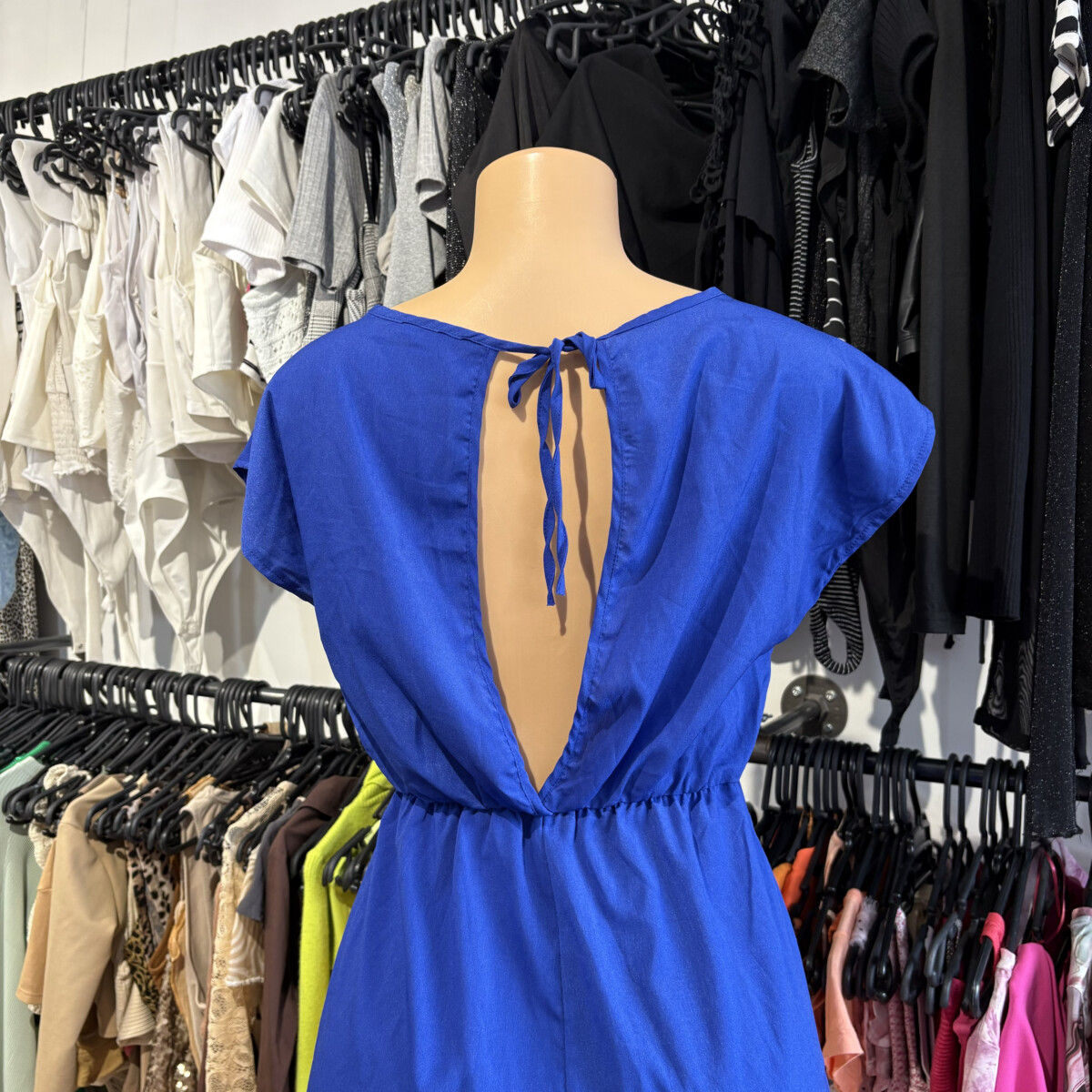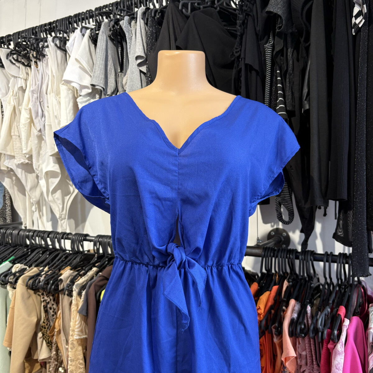 • Monito color azul, nudo adelante, escote en V, atado atrás